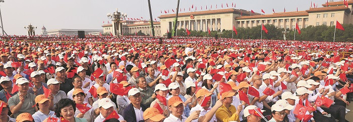 9月3日,参加纪念大会的观礼群众与现场合唱团一起高唱抗战主题歌曲。本报记者王伟伟摄